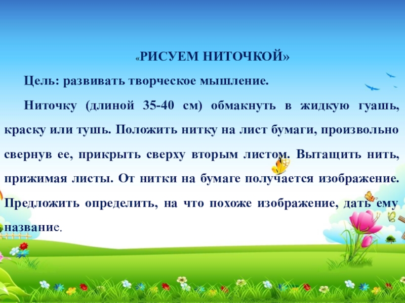 Ниточку (длиной 35-40 см) обмакнуть в жидкую гуашь, краску или тушь. Положить нитку на лист бумаги, произвольно свернув ее, прикрыть сверху вторым листом. Вытащить нить, прижимая листы. От нитки на бумаге получается изображение. Предложить определить, на что похоже изображение, дать ему название.