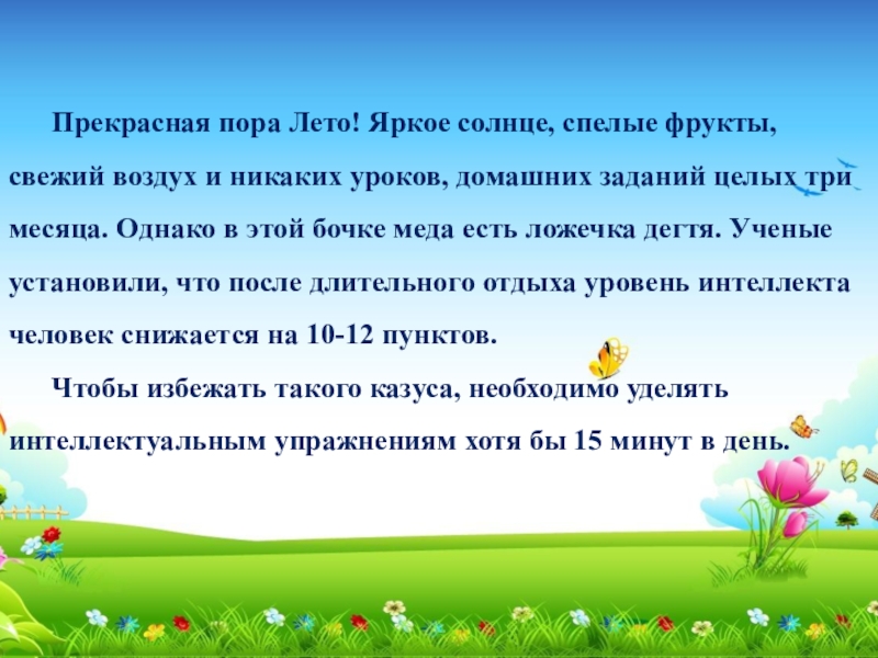 Прекрасная пора Лето! Яркое солнце, спелые фрукты, свежий воздух и никаких уроков, домашних заданий целых три месяца. Однако в этой бочке меда есть ложечка дегтя. Ученые установили, что после длительного отдыха уровень интеллекта человек снижается на 10-12 пунктов.