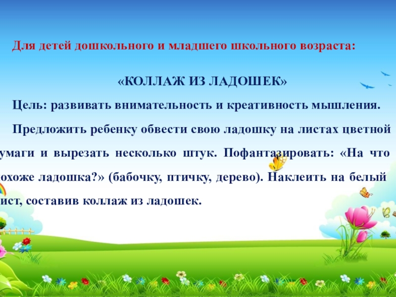 Предложить ребенку обвести свою ладошку на листах цветной бумаги и вырезать несколько штук. Пофантазировать: «На что похоже ладошка?» (бабочку, птичку, дерево). Наклеить на белый лист, составив коллаж из ладошек.