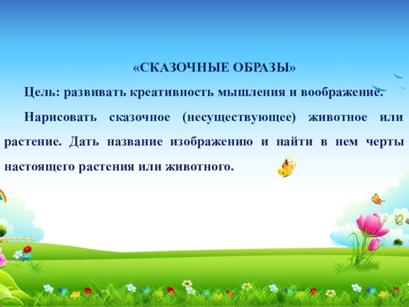 Нарисовать сказочное (несуществующее) животное или растение. Дать название изображению и найти в нем черты настоящего растения или животного.