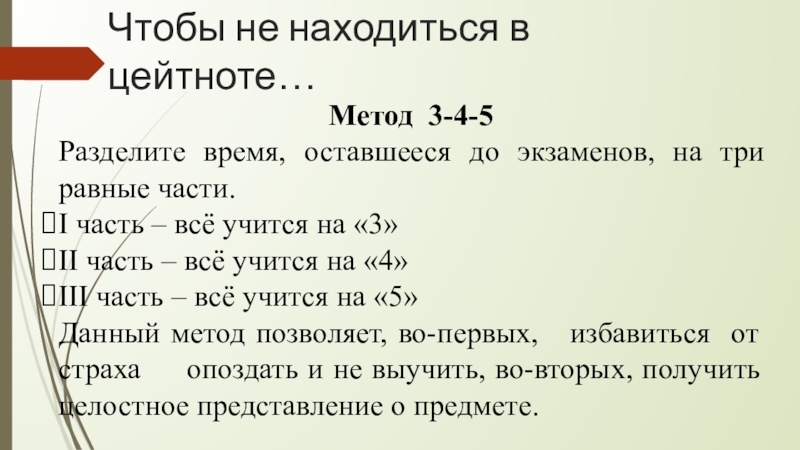 Данный метод позволяет, во-первых, избавиться от страха опоздать и не выучить, во-вторых, получить целостное представление о предмете.