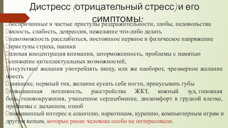 Слайд 9Дистресс (отрицательный стресс) и его симптомы: