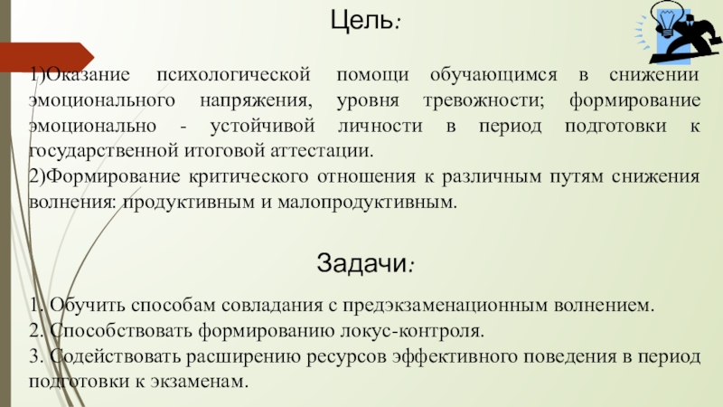 1. Обучить способам совладания с предэкзаменационным волнением.