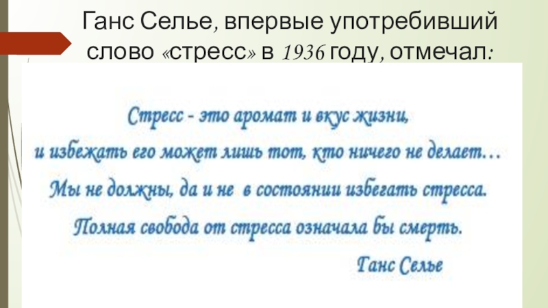 Слайд 8Ганс Селье, впервые употребивший слово «стресс» в 1936 году, отмечал: