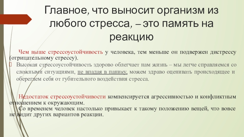 Слайд 11Главное, что выносит организм из любого стресса, – это память на