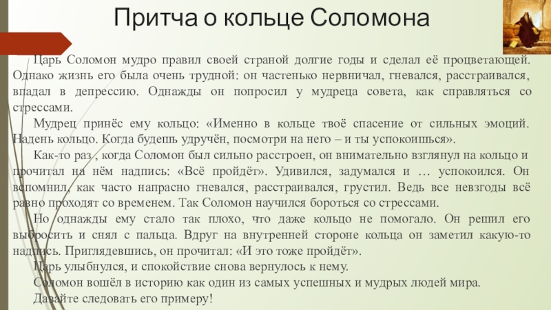 Как-то раз , когда Соломон был сильно расстроен, он внимательно взглянул на кольцо и прочитал на нём надпись: «Всё пройдёт». Удивился, задумался и … успокоился. Он вспомнил, как часто напрасно гневался, расстраивался, грустил. Ведь все невзгоды всё равно проходят со временем. Так Соломон научился бороться со стрессами.