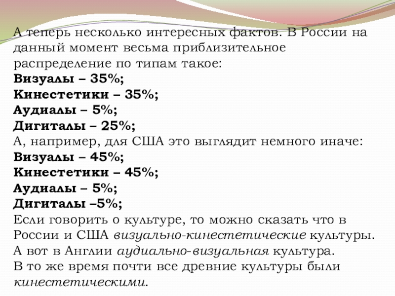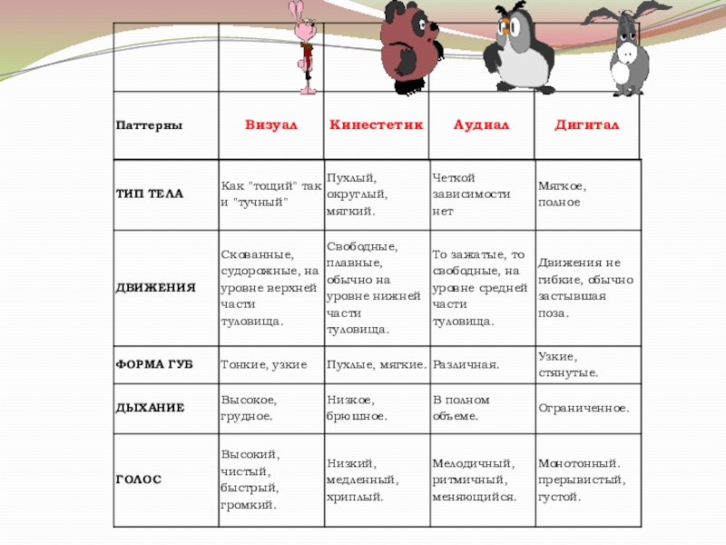 С аудиалом используя вариации голоса (громкость, паузы, высоту), отражая телом ритм речи (особенно головой) со скоростью, характерной для этого типа восприятия. С кинестетиком используя жесты, прикосновения. Чем больше преувеличения, тем лучше для запоминания. Возможно, позволять им проигрывать в ролях части вашей информации.