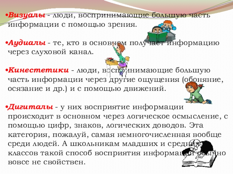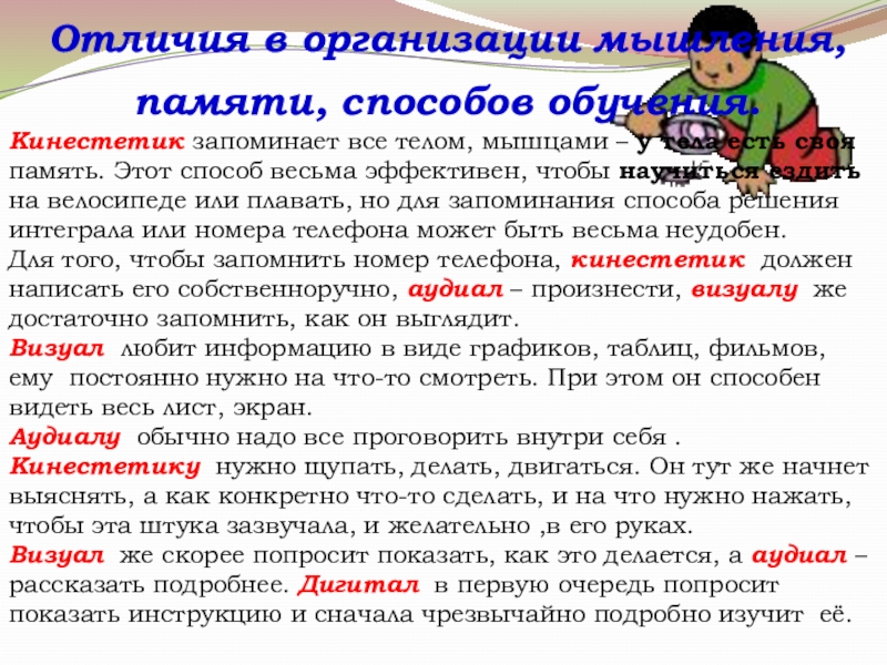Кинестетику – положить руку на плечо, тихонечко похлопать.