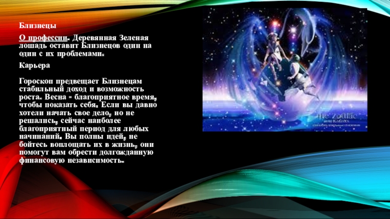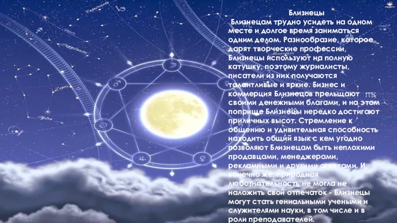 одним делом. Разнообразие, которое дарят творческие профессии, Близнецы используют на полную катушку, поэтому журналисты, писатели из них получаются талантливые и яркие. Бизнес и коммерция Близнецов прельщают своими денежными благами, и на этом поприще Близнецы нередко достигают приличных высот. Стремление к общению и удивительная способность находить общий язык с кем угодно позволяют Близнецам быть неплохими продавцами, менеджерами, рекламными и другими агентами. И, конечно же, природная любознательность не могла не наложить свой отпечаток - Близнецы могут стать гениальными учеными и служителями науки, в том числе и в роли преподавателей.