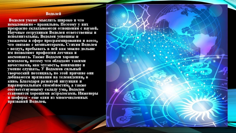 у них прекрасно складываются отношения с наукой. Научные сотрудники Водолеи ответственны и исполнительны. Водолеи успешны и уважаемы в сфере программирования и всего, что связано с компьютерами. Стихия Водолея - воздух, пребывать в ней как можно дольше им позволяют профессии летчика и космонавта. Также Водолеи хорошие психологи, потому что обладают такими качествами, как чуткость, понимание и умение слушать. У Водолеев сильный творческий потенциал, по этой причине они добиваются признания на телевидении, в кино. Благодаря развитой интуиции и паранормальным способностям, а также соответствующему складу ума, Водолеи становятся хорошими астрологами. Инженеры и шоферы - еще одни из многочисленных призваний Водолея.