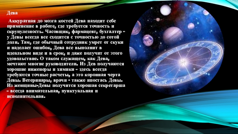 где требуется точность и скрупулезность. Часовщик, фармацевт, бухгалтер - у Девы всегда все сходится с точностью до сотой доли. Там, где обычный сотрудник умрет от скуки и наделает ошибок, Дева все выполнит в идеальном виде и в срок, и даже получит от этого удовольствие. О таком служащем, как Дева, мечтают многие руководители. Из Дев получаются хорошие инженеры и химики - здесь всегда требуются точные расчеты, а это коронная черта Девы. Ветеринары, врачи - также ипостась Девы. Из женщины-Девы получится хорошая секретарша - всегда внимательная, пунктуальная и исполнительная.