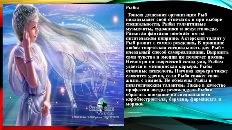 специальности. Рыбы талантливые музыканты, художники и искусствоведы. Развитая фантазия помогает им на писательском поприще. Актерский талант у Рыб развит с самого рождения. В принципе любая творческая специальность для Рыб - идеальный способ самореализации. Выразить свои чувства и эмоции им помогает поэзия. Несмотря на творческий склад ума, Рыбам удается и медицинская карьера. Рыбы отличные психологи. Научная карьера также сложится удачно, если Рыба свяжет свою жизнь с химией. Не обделены Рыбы и педагогическим талантом. Также в качестве профессии звезды рекомендуют Рыбам обратить внимание на специальности кораблестроителя, бармена, фармацевта и моряка.