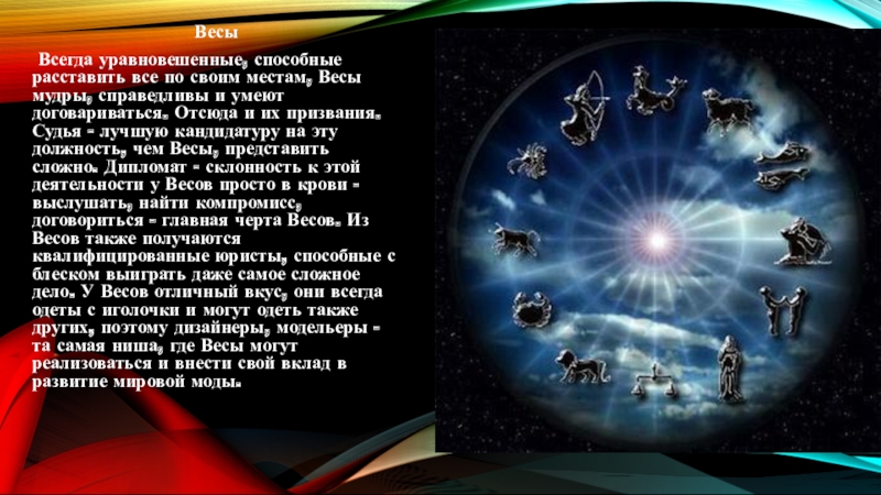 справедливы и умеют договариваться. Отсюда и их призвания. Судья - лучшую кандидатуру на эту должность, чем Весы, представить сложно. Дипломат - склонность к этой деятельности у Весов просто в крови - выслушать, найти компромисс, договориться - главная черта Весов. Из Весов также получаются квалифицированные юристы, способные с блеском выиграть даже самое сложное дело. У Весов отличный вкус, они всегда одеты с иголочки и могут одеть также других, поэтому дизайнеры, модельеры - та самая ниша, где Весы могут реализоваться и внести свой вклад в развитие мировой моды.
