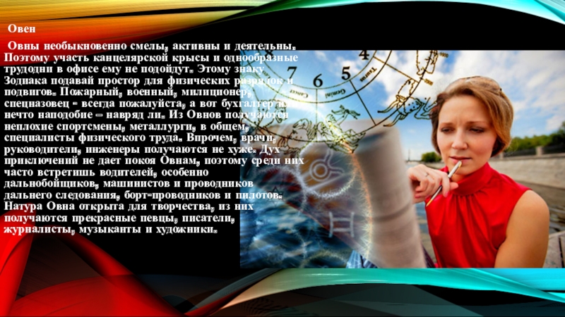 крысы и однообразные трудодни в офисе ему не подойдут. Этому знаку Зодиака подавай простор для физических разрядок и подвигов. Пожарный, военный, милиционер, спецназовец - всегда пожалуйста, а вот бухгалтер или нечто наподобие – навряд ли. Из Овнов получаются неплохие спортсмены, металлурги, в общем, специалисты физического труда. Впрочем, врачи, руководители, инженеры получаются не хуже. Дух приключений не дает покоя Овнам, поэтому среди них часто встретишь водителей, особенно дальнобойщиков, машинистов и проводников дальнего следования, борт-проводников и пилотов. Натура Овна открыта для творчества, из них получаются прекрасные певцы, писатели, журналисты, музыканты и художники.