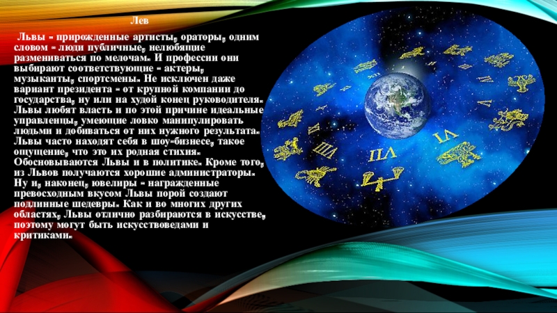 нелюбящие размениваться по мелочам. И профессии они выбирают соответствующие - актеры, музыканты, спортсмены. Не исключен даже вариант президента - от крупной компании до государства, ну или на худой конец руководителя. Львы любят власть и по этой причине идеальные управленцы, умеющие ловко манипулировать людьми и добиваться от них нужного результата. Львы часто находят себя в шоу-бизнесе, такое ощущение, что это их родная стихия. Обосновываются Львы и в политике. Кроме того, из Львов получаются хорошие администраторы. Ну и, наконец, ювелиры - награжденные превосходным вкусом Львы порой создают подлинные шедевры. Как и во многих других областях, Львы отлично разбираются в искусстве, поэтому могут быть искусствоведами и критиками.