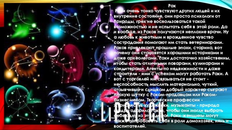 они просто психологи от природы, грех не воспользоваться такой возможностью и не испытать себя в этой роли. Да и вообще, из Раков получаются неплохие врачи. Ну а любовь к животным и врожденное чувство сострадания помогают им стать ветеринарами. Раков привлекают прошлые эпохи, старина, вот почему они становятся хорошими историками и даже археологами. Раки достаточно хозяйственны, чтобы стать отличными поварами, кулинарами и кондитерами. Агенты по недвижимости и даже строители - ими с успехом могут работать Раки. А вот с торговлей им связываться не стоит - неспособность мыслить материально, чуткий, отзывчивый и слишком добрый характер сыграют плохую шутку с Раком-продавцом или Раком-бизнесменом. Творческие профессии - журналисты, художники, музыканты - природа щедро одарила Раков, чтобы они могли выбрать себе одну из этих дорог. Раки-женщины могут также попробовать себя в роли домохозяек, нянь и воспитателей.