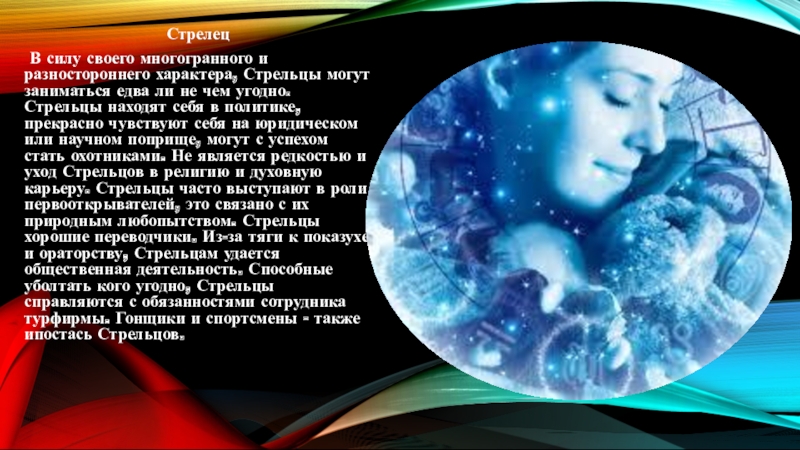 едва ли не чем угодно. Стрельцы находят себя в политике, прекрасно чувствуют себя на юридическом или научном поприще, могут с успехом стать охотниками. Не является редкостью и уход Стрельцов в религию и духовную карьеру. Стрельцы часто выступают в роли первооткрывателей, это связано с их природным любопытством. Стрельцы хорошие переводчики. Из-за тяги к показухе и ораторству, Стрельцам удается общественная деятельность. Способные уболтать кого угодно, Стрельцы справляются с обязанностями сотрудника турфирмы. Гонщики и спортсмены - также ипостась Стрельцов.