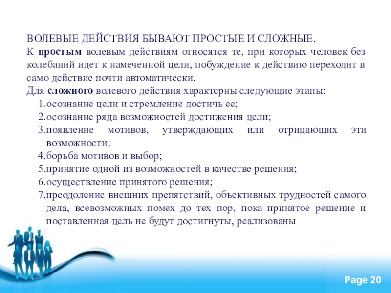 Слайд 20ВОЛЕВЫЕ ДЕЙСТВИЯ БЫВАЮТ ПРОСТЫЕ И СЛОЖНЫЕ.
