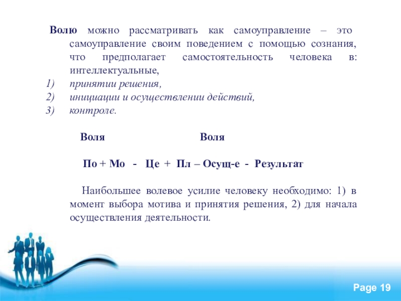 Слайд 19Волю можно рассматривать как самоуправление – это самоуправление своим поведением с