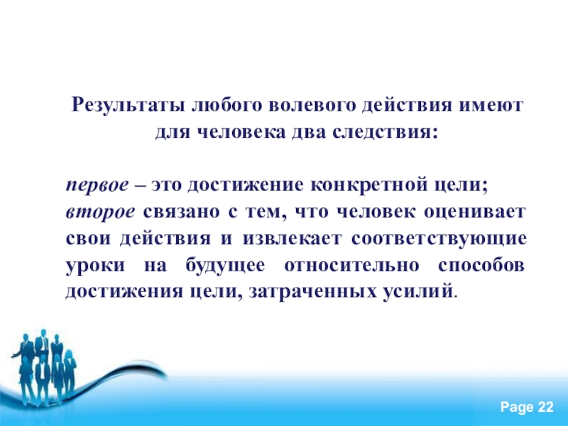 Слайд 22Результаты любого волевого действия имеют для человека два следствия:
