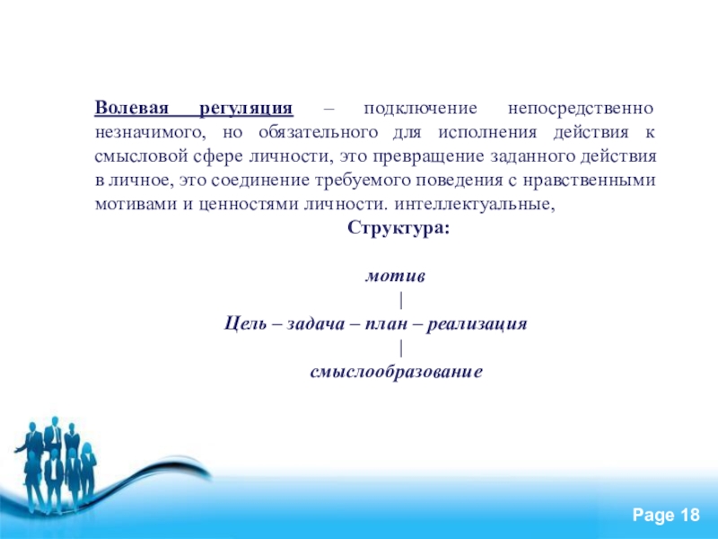Слайд 18Волевая регуляция – подключение непосредственно незначимого, но обязательного для исполнения действия