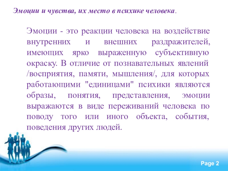 человека на воздействие внутренних и внешних раздражителей, имеющих ярко выраженную субъективную окраску. В отличие от познавательных явлений /восприятия, памяти, мышления/, для которых работающими "единицами" психики являются образы, понятия, представления, эмоции выражаются в виде переживаний человека по поводу того или иного объекта, события, поведения других людей.