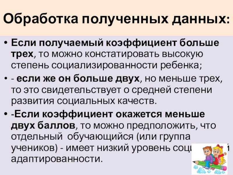 -Если коэффициент окажется меньше двух баллов, то можно предположить, что отдельный обучающийся (или группа учеников) - имеет низкий уровень социальной адаптированности.