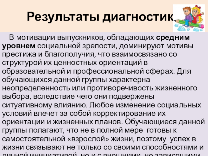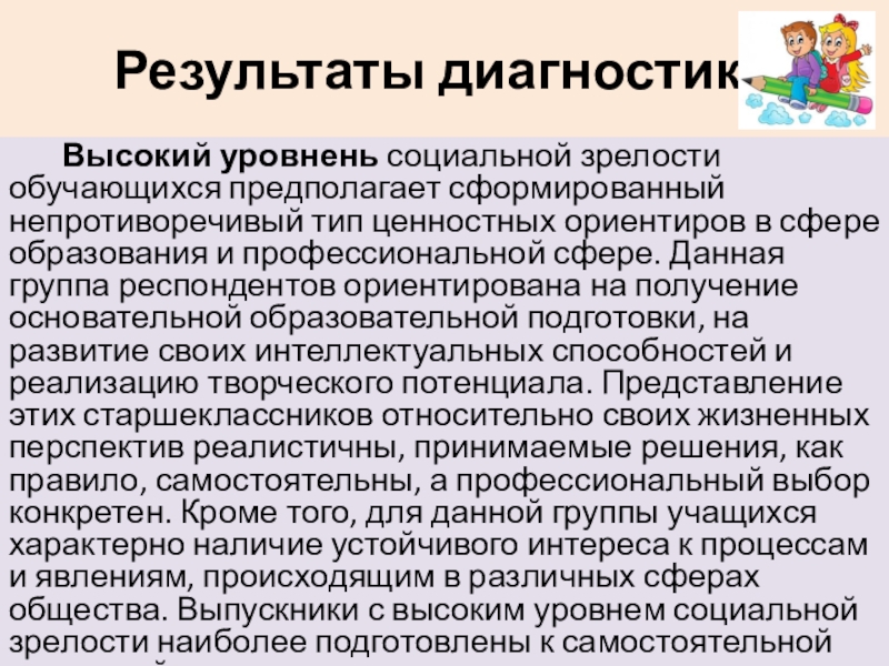 непротиворечивый тип ценностных ориентиров в сфере образования и профессиональной сфере. Данная группа респондентов ориентирована на получение основательной образовательной подготовки, на развитие своих интеллектуальных способностей и реализацию творческого потенциала. Представление этих старшеклассников относительно своих жизненных перспектив реалистичны, принимаемые решения, как правило, самостоятельны, а профессиональный выбор конкретен. Кроме того, для данной группы учащихся характерно наличие устойчивого интереса к процессам и явлениям, происходящим в различных сферах общества. Выпускники с высоким уровнем социальной зрелости наиболее подготовлены к самостоятельной «взрослой жизни».