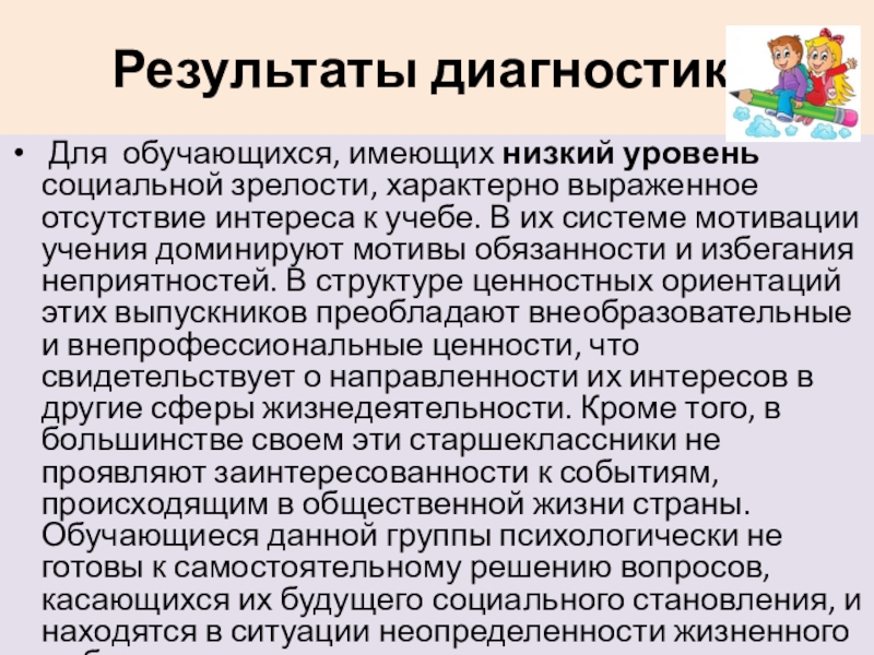 интереса к учебе. В их системе мотивации учения доминируют мотивы обязанности и избегания неприятностей. В структуре ценностных ориентаций этих выпускников преобладают внеобразовательные и внепрофессиональные ценности, что свидетельствует о направленности их интересов в другие сферы жизнедеятельности. Кроме того, в большинстве своем эти старшеклассники не проявляют заинтересованности к событиям, происходящим в общественной жизни страны. Обучающиеся данной группы психологически не готовы к самостоятельному решению вопросов, касающихся их будущего социального становления, и находятся в ситуации неопределенности жизненного выбора.