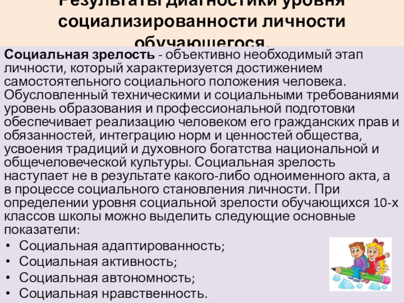 который характеризуется достижением самостоятельного социального положения человека. Обусловленный техническими и социальными требованиями уровень образования и профессиональной подготовки обеспечивает реализацию человеком его гражданских прав и обязанностей, интеграцию норм и ценностей общества, усвоения традиций и духовного богатства национальной и общечеловеческой культуры. Социальная зрелость наступает не в результате какого-либо одноименного акта, а в процессе социального становления личности. При определении уровня социальной зрелости обучающихся 10-х классов школы можно выделить следующие основные показатели: