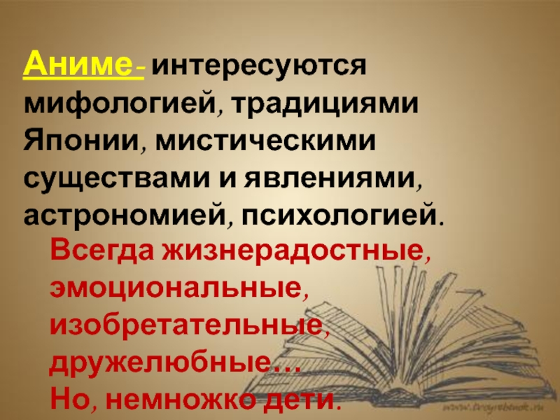 Слайд 8Аниме- интересуются мифологией, традициями Японии, мистическими существами и явлениями, астрономией, психологией.