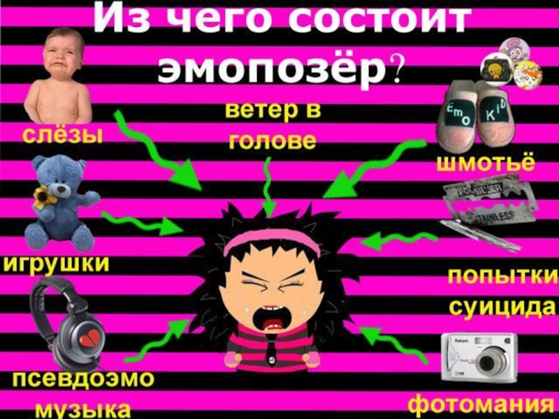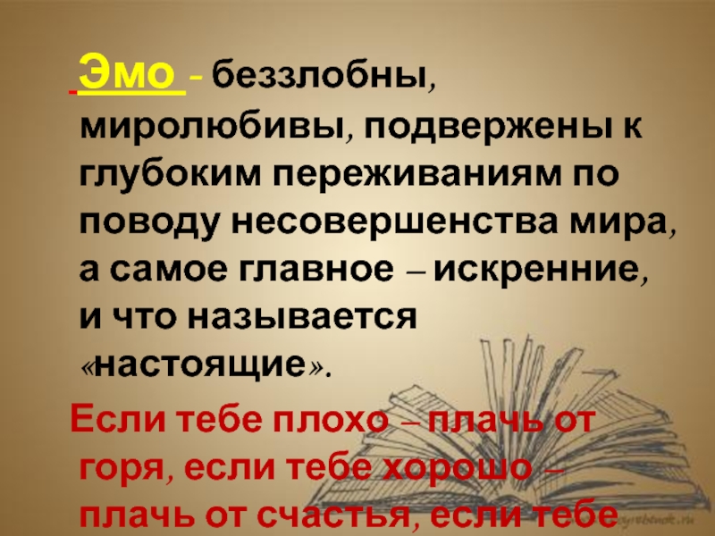 Слайд 3 Эмо - беззлобны, миролюбивы, подвержены к глубоким переживаниям по