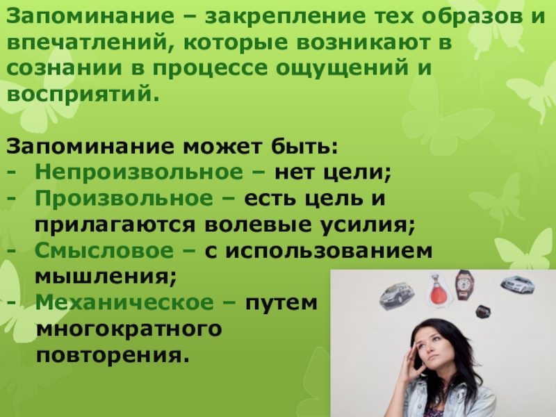 Слайд 4Запоминание – закрепление тех образов и впечатлений, которые возникают в сознании