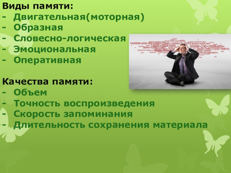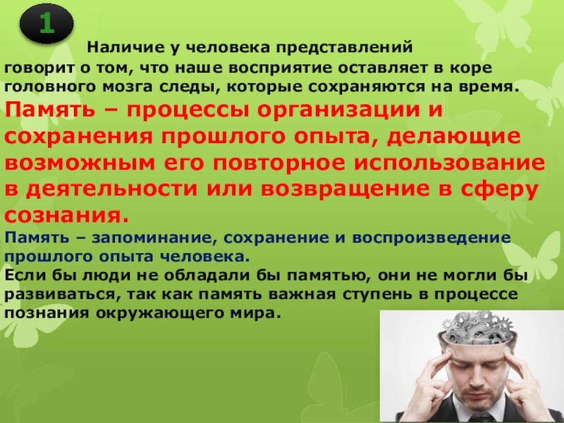 Память – запоминание, сохранение и воспроизведение прошлого опыта человека.
