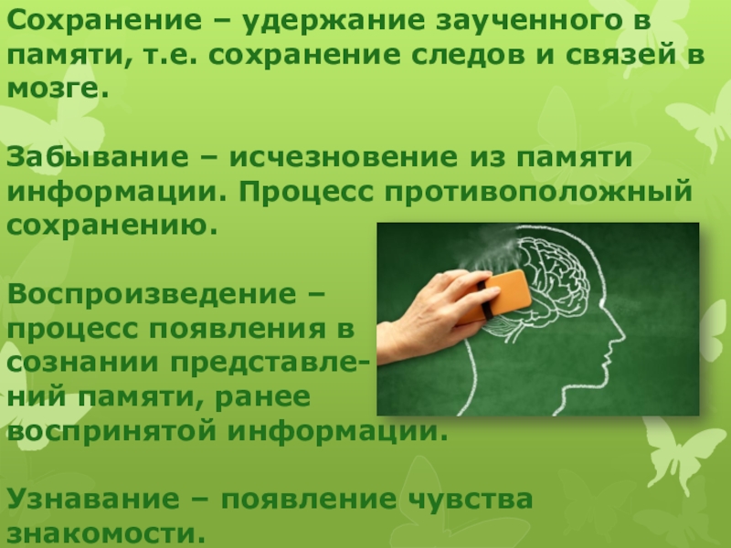 Забывание – исчезновение из памяти информации. Процесс противоположный сохранению.