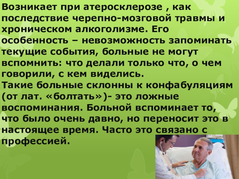 Такие больные склонны к конфабуляциям (от лат. «болтать»)- это ложные воспоминания. Больной вспоминает то, что было очень давно, но переносит это в настоящее время. Часто это связано с профессией.