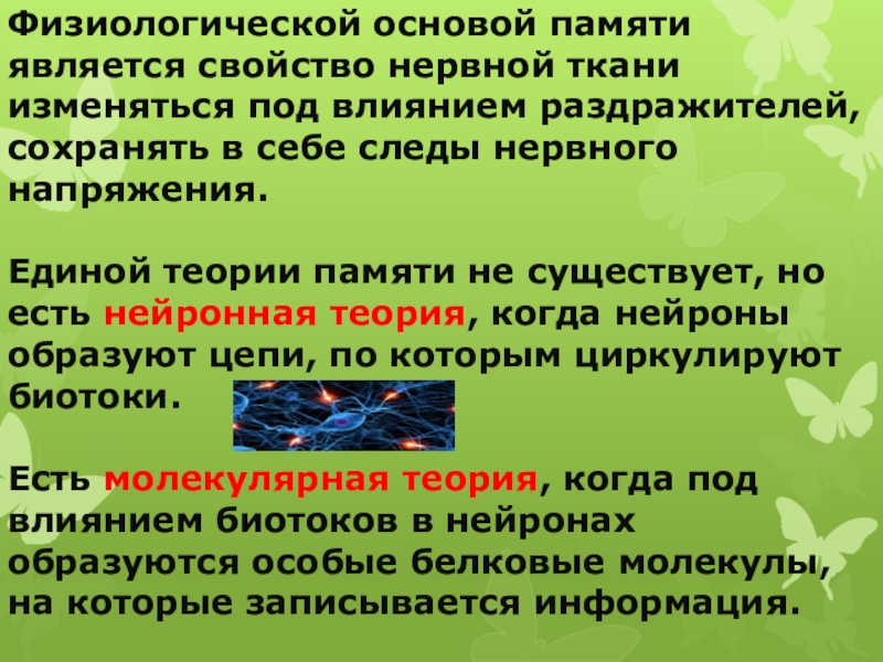 Слайд 7Физиологической основой памяти является свойство нервной ткани изменяться под влиянием раздражителей,