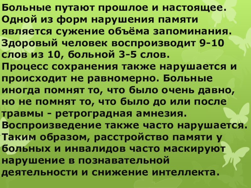 Слайд 11Больные путают прошлое и настоящее. Одной из форм нарушения памяти является