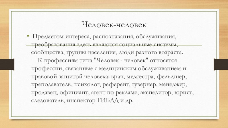 К профессиям типа "Человек - человек" относятся профессии, связанные с медицинским обслуживанием и правовой защитой человека: врач, медсестра, фельдшер, преподаватель, психолог, референт, гувернер, менеджер, продавец, официант, агент по рекламе, экспедитор, юрист, следователь, инспектор ГИБДД и др.