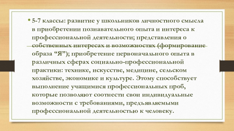 и интереса к профессиональной деятельности; представления о собственных интересах и возможностях (формирование образа “Я”); приобретение первоначального опыта в различных сферах социально-профессиональной практики: технике, искусстве, медицине, сельском хозяйстве, экономике и культуре. Этому способствует выполнение учащимися профессиональных проб, которые позволяют соотнести свои индивидуальные возможности с требованиями, предъявляемыми профессиональной деятельностью к человеку.