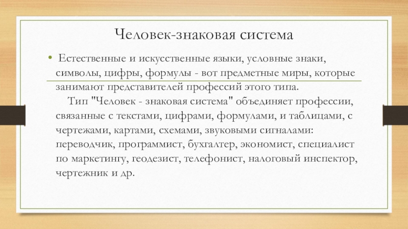 Тип "Человек - знаковая система" объединяет профессии, связанные с текстами, цифрами, формулами, и таблицами, с чертежами, картами, схемами, звуковыми сигналами: переводчик, программист, бухгалтер, экономист, специалист по маркетингу, геодезист, телефонист, налоговый инспектор, чертежник и др.