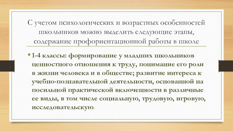 Слайд 4С учетом психологических и возрастных особенностей школьников можно выделить следующие этапы, содержание