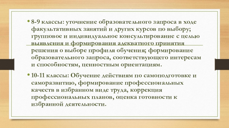 по выбору; групповое и индивидуальное консультирование с целью выявления и формирования адекватного принятия решения о выборе профиля обучения; формирование образовательного запроса, соответствующего интересам и способностям, ценностным ориентациям.