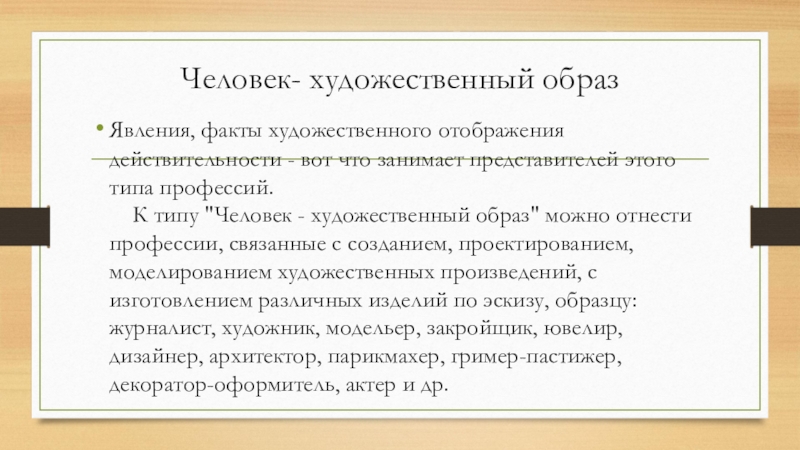 К типу "Человек - художественный образ" можно отнести профессии, связанные с созданием, проектированием, моделированием художественных произведений, с изготовлением различных изделий по эскизу, образцу: журналист, художник, модельер, закройщик, ювелир, дизайнер, архитектор, парикмахер, гример-пастижер, декоратор-оформитель, актер и др.