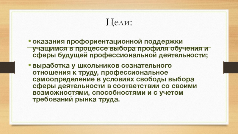 выработка у школьников сознательного отношения к труду, профессиональное самоопределение в условиях свободы выбора сферы деятельности в соответствии со своими возможностями, способностями и с учетом требований рынка труда.