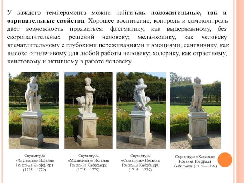 воспитание, контроль и самоконтроль дает возможность проявиться: флегматику, как выдержанному, без скоропалительных решений человеку; меланхолику, как человеку впечатлительному с глубокими переживаниями и эмоциями; сангвинику, как высоко отзывчивому для любой работы человеку; холерику, как страстному, неистовому и активному в работе человеку.