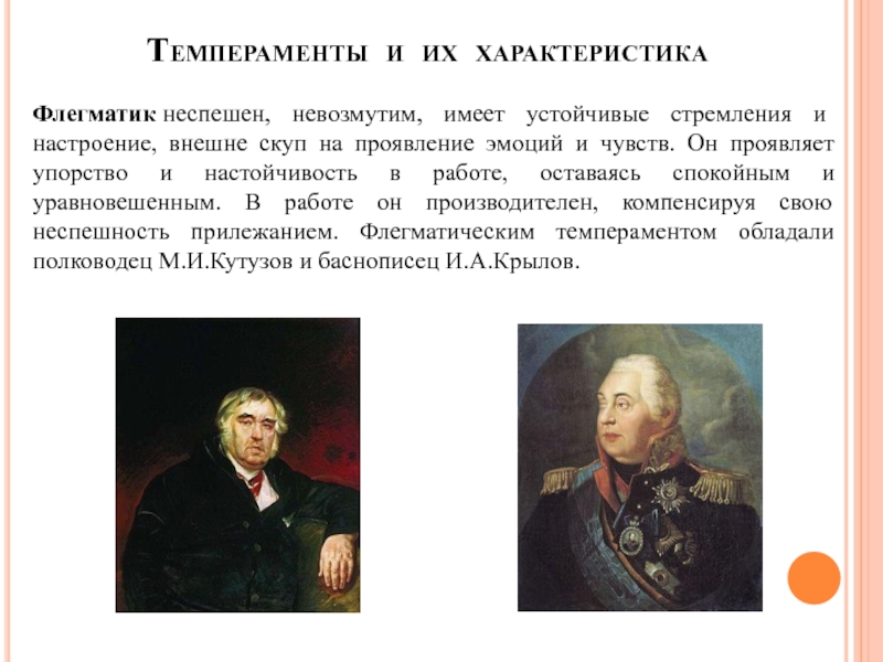 скуп на проявление эмоций и чувств. Он проявляет упорство и настойчивость в работе, оставаясь спокойным и уравновешенным. В работе он производителен, компенсируя свою неспешность прилежанием. Флегматическим темпераментом обладали полководец М.И.Кутузов и баснописец И.А.Крылов.