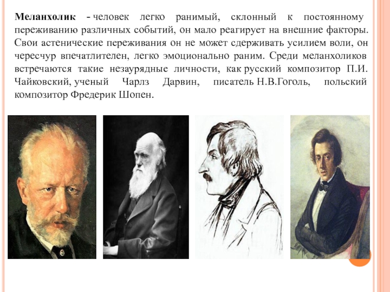мало реагирует на внешние факторы. Свои астенические переживания он не может сдерживать усилием воли, он чересчур впечатлителен, легко эмоционально раним. Среди меланхоликов встречаются такие незаурядные личности, как русский композитор П.И.Чайковский, ученый Чарлз Дарвин, писатель Н.В.Гоголь, польский композитор Фредерик Шопен.