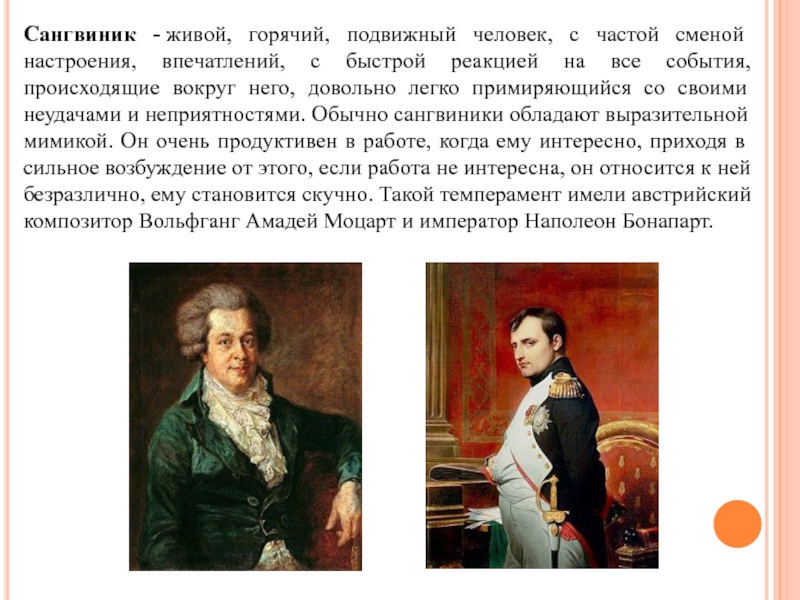 быстрой реакцией на все события, происходящие вокруг него, довольно легко примиряющийся со своими неудачами и неприятностями. Обычно сангвиники обладают выразительной мимикой. Он очень продуктивен в работе, когда ему интересно, приходя в сильное возбуждение от этого, если работа не интересна, он относится к ней безразлично, ему становится скучно. Такой темперамент имели австрийский композитор Вольфганг Амадей Моцарт и император Наполеон Бонапарт.