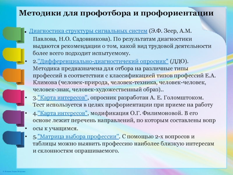 Павлова, Н.О. Садовникова). По результатам диагностики выдаются рекомендации о том, какой вид трудовой деятельности более всего подходит испытуемому.